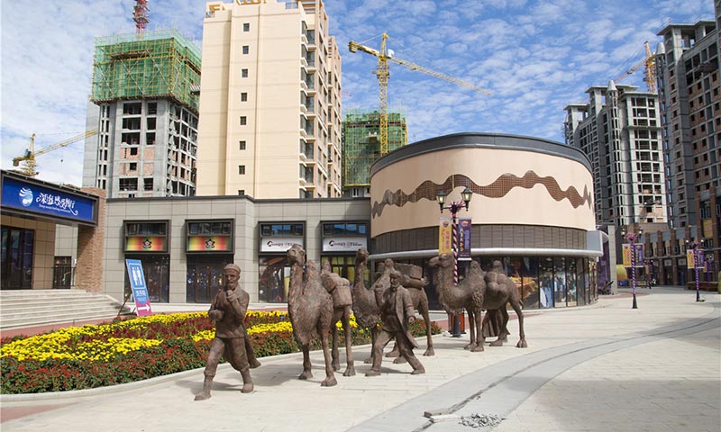 重點(diǎn)打造的絲路金街,由整個(gè)項(xiàng)目的主軸線-----商業(yè)步行街及500米帶狀公園組成。整體設(shè)計(jì)中突出強(qiáng)烈的絲路元素,以“流動(dòng)的彩綢”為設(shè)計(jì)靈感,將13000公里長的古絲綢之路全程按1:15000的比例進(jìn)行了完美濃縮,以沿途最重要城市為節(jié)點(diǎn)打造的五大主題雕塑群將整條金街完美相連。